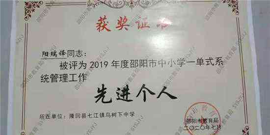 陽瑞鋒,今年42歲,湖南省武崗師范學(xué)校中師畢業(yè),后在湖南師范大學(xué)本科脫產(chǎn)學(xué)習(xí),獲大學(xué)學(xué)歷。他1999年7月參加教育工作,2009年9月至2019年11月在隆回縣七江鎮(zhèn)中學(xué)擔(dān)任教導(dǎo)主任,2019年11月至今在隆回縣七江鎮(zhèn)鳥樹下中學(xué)任政教副校長。他參加教育工作22年來,追求進步,光榮地加入了中國共產(chǎn)黨,現(xiàn)擔(dān)任湖南省隆回縣七江鎮(zhèn)鳥樹下中學(xué)政教副校長并兼七江鎮(zhèn)中心學(xué)校扶貧專干,他管理著全鎮(zhèn)教育精準扶貧服務(wù)系統(tǒng)工作。工作中,他始終以飽滿的工作熱情,踏實的工作作風(fēng)和認真的工作態(tài)度,贏得了領(lǐng)導(dǎo)、同事、學(xué)生與家長的好評,在平凡的崗位上,取得了顯著的成績。
