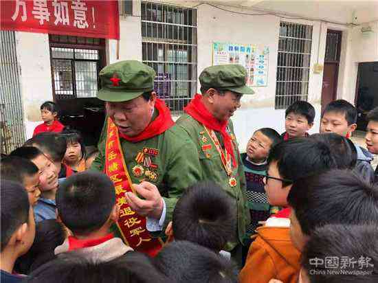 兩位老兵的紅色故事演講在上午的10:30分準(zhǔn)時(shí)開始,孩子們舞動著鮮艷的五星紅旗歡迎老兵的演講。少先隊(duì)員為老兵楊友良和羅艾群佩戴紅領(lǐng)巾并獻(xiàn)上鮮花。