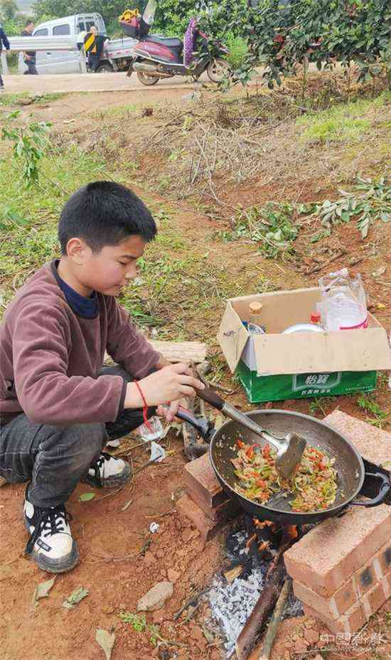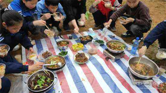 上午11點,學生集合從學校出發(fā),他們舉著隊旗、國旗,一路歡歌,高高興興來到野外。此次活動還有半數(shù)以上的家長參加,同學們帶了鐵鍬、餐具、各種食材、調(diào)料。全班學生分成三組開展野炊活動。學生撿來了燒材,野炊開始了,大家分工協(xié)作,家長在一旁指導,很快幾大桌豐盛的飯菜就做成了,學生、老師、家長圍在一起品嘗美味。有些孩子從來沒有做過飯,在家長的指導下,這次也特別來勁,因為是野外,煙熏火燎,有的學生臉上雖然臟了,但模樣更加覺得可愛。午餐后,學生將餐具洗刷得干干凈凈,將場地的垃圾也全部清理掉,不留一點痕跡。