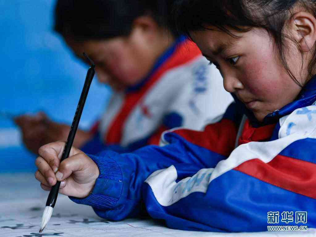 在玉樹藏族自治州紅旗小學,學生在上書法課。當?shù)貙W?;A(chǔ)設(shè)施建設(shè)、教學配套資源提檔升級獲得了教育援青項目支持(3月19日攝)。