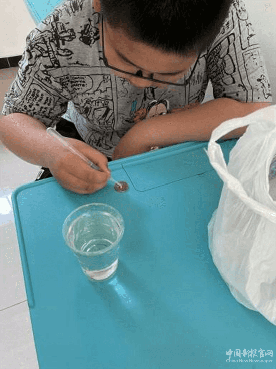 小實驗名叫硬幣上負載的水滴。大家都不相信一枚硬幣上僅能容下100滴水滴,實驗結果讓大家驚奇。社工解釋說硬幣能封存這么多的水,不是硬幣的功勞,而是憑借了水的漲力特性:液體表面分子外部和內部的分子密度不同導致受力不同,形成了一個向內的作用力,這個向內的力量支撐著水不外溢。