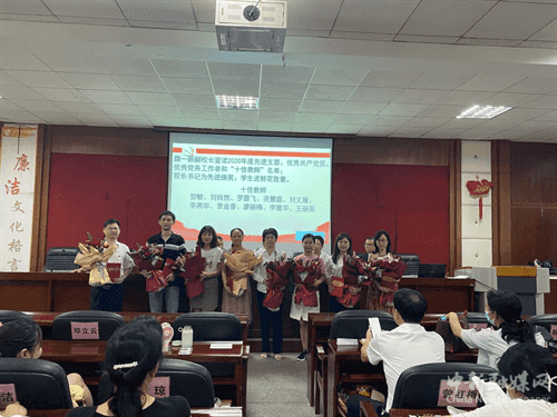 該校副校長顏一新宣讀2020年度衡陽市實(shí)驗(yàn)中學(xué)先進(jìn)黨支部、優(yōu)秀共產(chǎn)黨員、優(yōu)秀黨務(wù)工作者和校“十佳教師”名單。校領(lǐng)導(dǎo)為10位校優(yōu)秀共產(chǎn)黨員、7位優(yōu)秀黨務(wù)工作者、10位“十佳”教師頒獎,學(xué)生送鮮花致意。顏一新副校長還給大家?guī)砣齽t喜訊:學(xué)校陳昌輝老師榮獲湖南省優(yōu)秀共產(chǎn)黨員稱號;校黨總支書記鄧永紅榮獲市教育系統(tǒng)優(yōu)秀黨務(wù)工作者稱號,并在支部書記黨史學(xué)習(xí)競賽中獲二等獎;校團(tuán)委書記尹湘萍在市教育系統(tǒng)“師魂映黨旗”演講賽中獲一等獎。