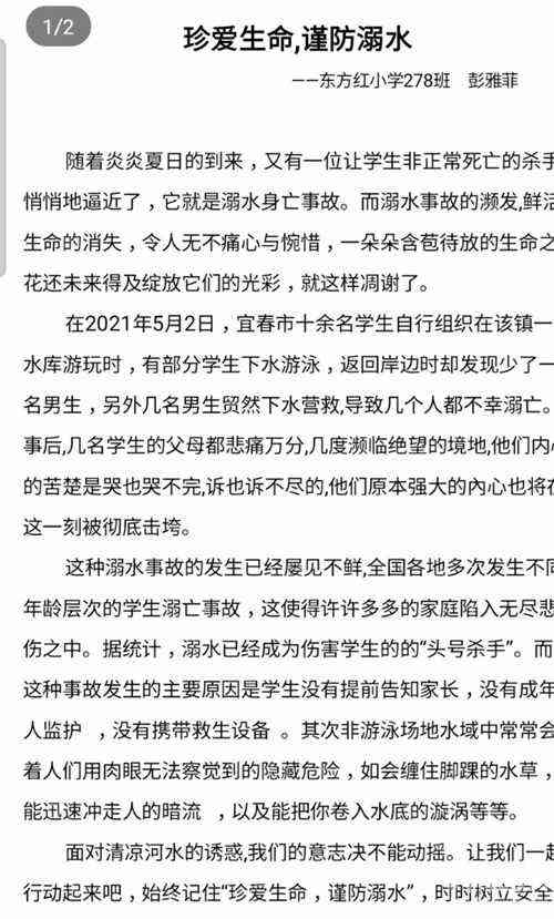 自從活動開展以來,該校3年級至6年級的同學積極參與了本次活動,累計收到征文兩千余篇。他們在班主任的指導下精心準備比賽,通過閱讀大量防溺水安全教育的文章、上網(wǎng)查找防溺水的相關知識,同時結(jié)合身邊的事例,寫出了一篇篇發(fā)自肺腑、發(fā)人深省的征文。