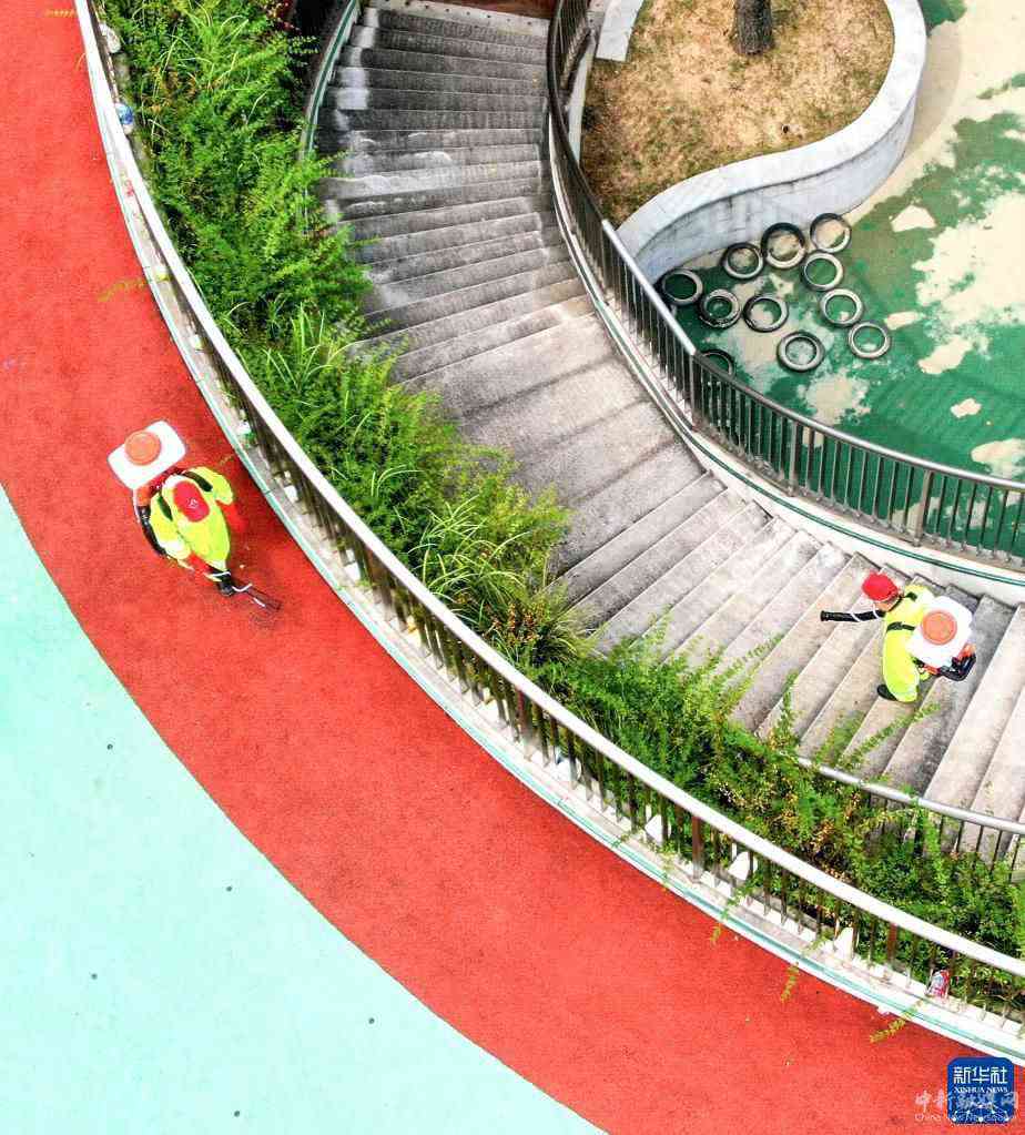 8月28日,工作人員在浙江省湖州市長興縣龍山街道中心幼兒園對校園環(huán)境進行全面消殺(無人機照片)。