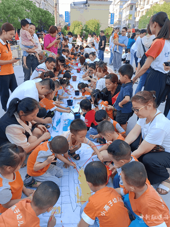 小朋友和家長(zhǎng)在“百人長(zhǎng)卷書(shū)畫(huà)”中作畫(huà)