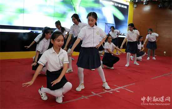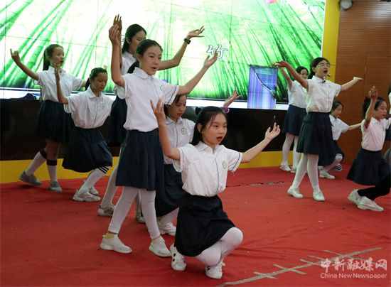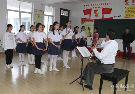 2021年10月11日,在安徽省合肥市廬江縣城北小學,10余名孩子在兩位演出團體志愿者老師的帶領下,學習戲曲經典曲目《打豬草》的聲腔及形體動作。
