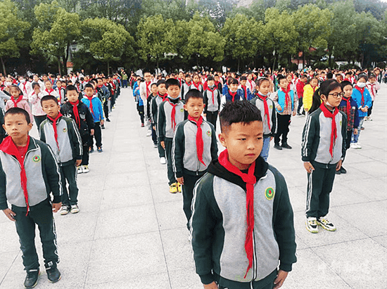 紅領(lǐng)巾二星章獲獎(jiǎng)隊(duì)員代表全體少先隊(duì)員在隊(duì)旗下宣誓:“我們會(huì)把習(xí)爺爺教導(dǎo)記心上,刻苦學(xué)習(xí)知識(shí)、堅(jiān)定理想信念、磨練堅(jiān)強(qiáng)意志、鍛煉健強(qiáng)體魄,為實(shí)現(xiàn)中華民族偉大復(fù)興的中國(guó)夢(mèng)時(shí)刻準(zhǔn)備著。”