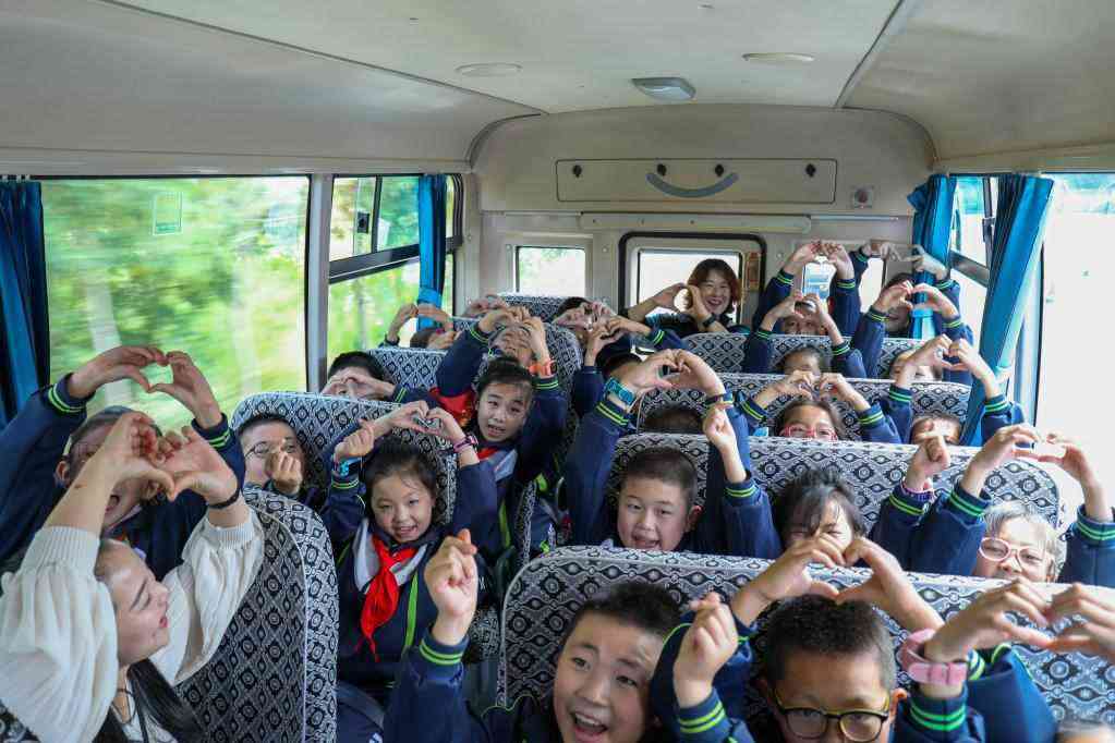 渭州學校的學生和老師在校車上一起“比心”。新華社記者王紫軒 攝