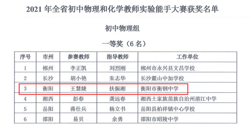 12月21日,湖南省初中物理實(shí)驗(yàn)?zāi)苁执筚惈@獎(jiǎng)名單公布,衡陽(yáng)市衡鋼中學(xué)王慧婕老師榮獲一等獎(jiǎng)!
