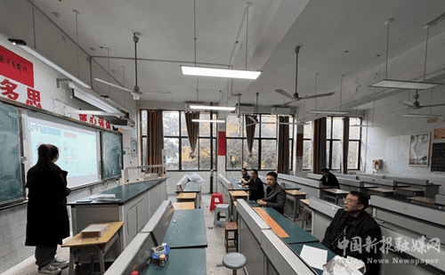 校長(zhǎng)郭平貴與市教育裝備站領(lǐng)導(dǎo)一同觀摩王慧婕老師的實(shí)驗(yàn)