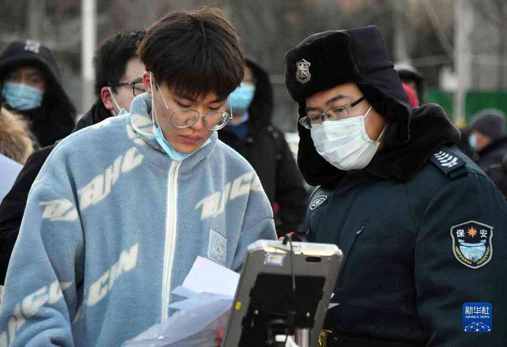 12月25日,在北京理工大學(xué)考點(diǎn),工作人員(右)通過(guò)人臉識(shí)別的方式核對(duì)考生信息。新華社記者 任超 攝