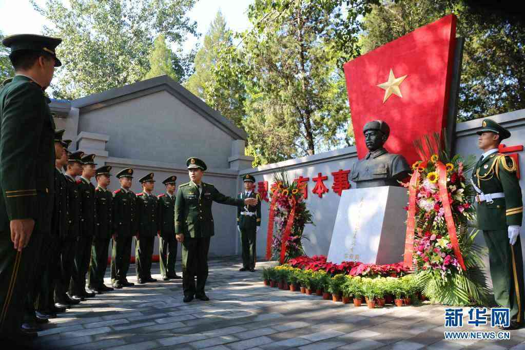 武警北京總隊執(zhí)勤九支隊官兵在李登貴烈士雕像前舉行紀念活動(2016年9月8日攝)。新華社發(fā)(武炎龍 攝)