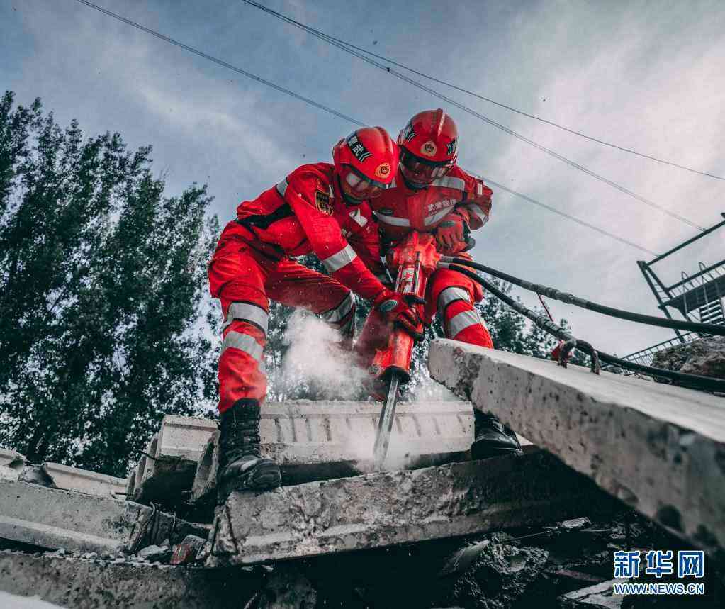 武警北京總隊機動一支隊官兵組織液壓破碎鎬破拆水泥板訓練(2020年8月11日攝)。新華社發(fā)(申鴻浩 攝)