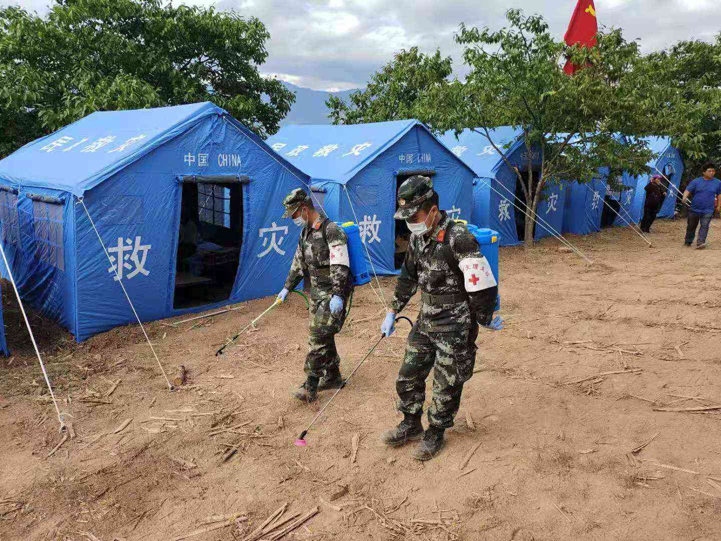 武警云南總隊(duì)大理支隊(duì)官兵在受災(zāi)群眾集中安置點(diǎn)進(jìn)行衛(wèi)生消殺。馬亮志 攝