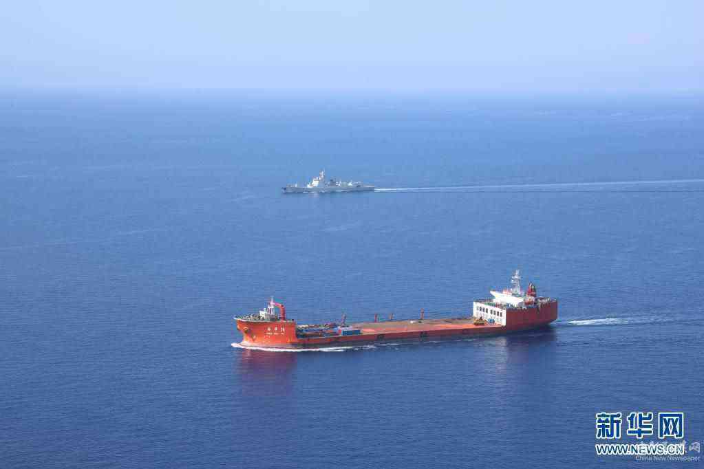 中國海軍第37批護航編隊長沙艦(后)為中國“振華28號”商船伴隨護航(5月28日攝)。