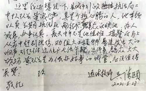 “縣城管執(zhí)法局中隊(duì)長黃誠華,真是個(gè)熱心腸的人,他帶領(lǐng)隊(duì)員長期執(zhí)法在南街,群眾反映他,為人誠懇、辦事認(rèn)真……”這是前不久黃山市休寧縣南街群眾吳阿姨寫的一封感謝信。