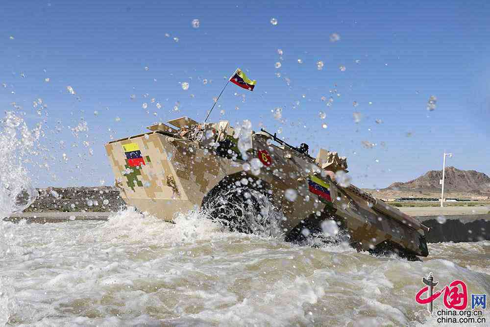 8月24日,“國際軍事比賽-2021”中國庫爾勒賽區(qū)“晴空”項(xiàng)目首場比賽技能賽在庫爾勒開賽,委內(nèi)瑞拉參賽車組通過涉水場。姜東坡 攝