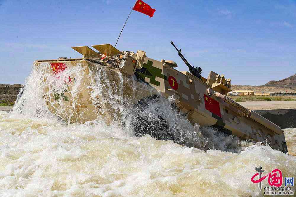 8月24日,“國際軍事比賽-2021”中國庫爾勒賽區(qū)“晴空”項(xiàng)目首場比賽技能賽在庫爾勒開賽,中國參賽車組通過涉水場。姜東坡 攝