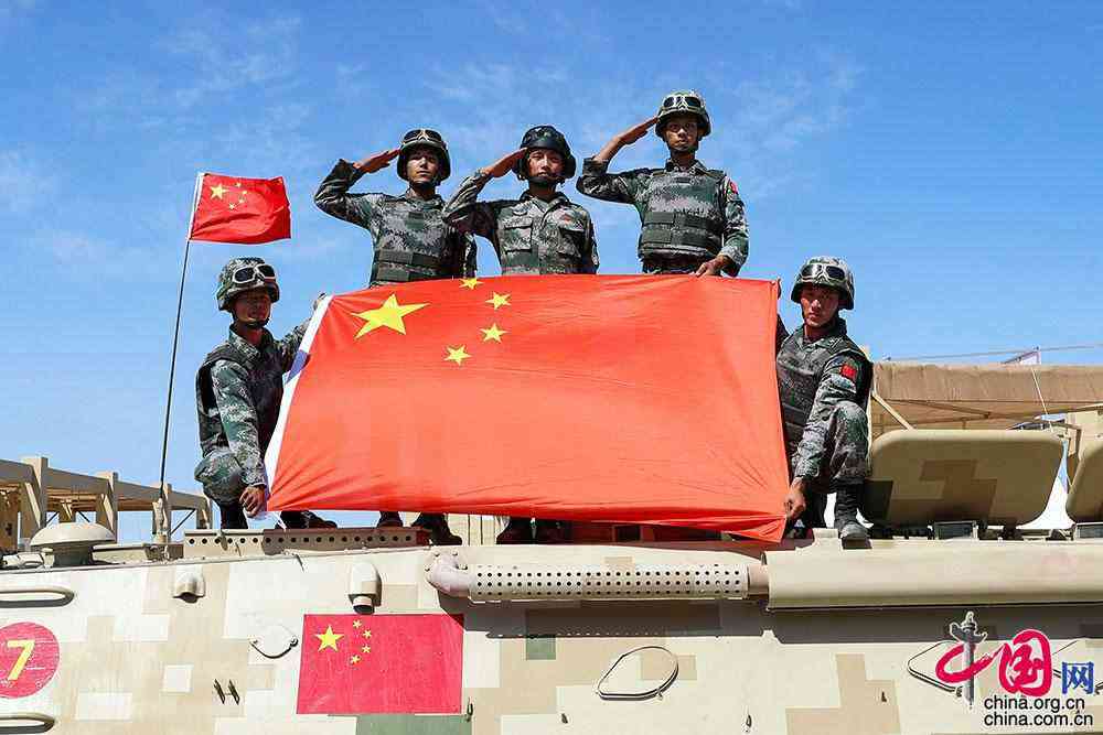 8月24日,“國際軍事比賽-2021”中國庫爾勒賽區(qū)“晴空”項(xiàng)目首場比賽技能賽在庫爾勒開賽,中國參賽隊(duì)員賽后與國旗合影。姜東坡 攝
