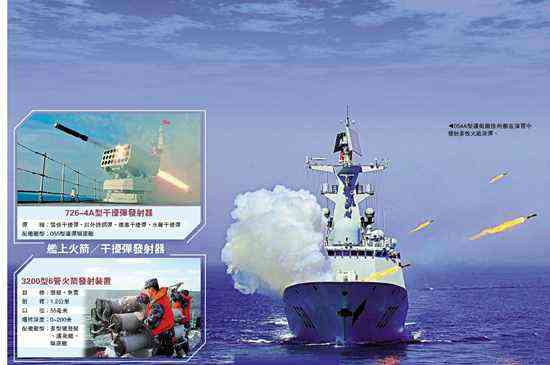 在海軍各型導(dǎo)彈驅(qū)逐艦、護(hù)衛(wèi)艦上,都安裝一種火箭發(fā)射器或干擾彈發(fā)射裝置,用于發(fā)射反潛深彈、干擾彈。前者可透過(guò)持續(xù)密集發(fā)射形成火力矩陣,大范圍攻擊、壓制周?chē)臐撏АⅣ~(yú)雷、蛙人等水下隱患,防御、應(yīng)對(duì)它們的突然偷襲;后者則可干擾、誘騙來(lái)襲導(dǎo)彈,隱蔽掩護(hù)艦艇撤離。這對(duì)于提高艦艇的海上生存能力和攻擊力,都具有十分重要的作用。