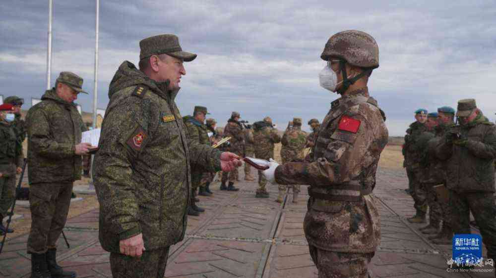 9月24日,在俄羅斯奧倫堡州東古茲靶場舉行的“和平使命-2021”上海合作組織聯(lián)合反恐軍事演習閉幕式上,中方參演部隊官兵代表接受獎章。新華社記者梅世雄攝
