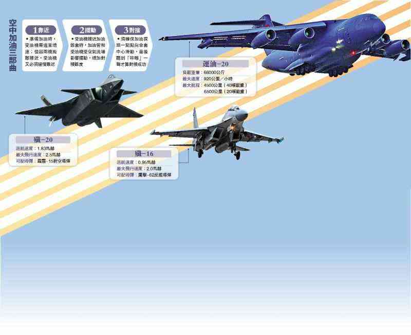 國產(chǎn)大型加油機──運油-20日前首次亮相臺海。運油-20以運-20“鯤鵬”大型遠程運輸機為平臺改裝而成。在11月28日的臺海巡航中,1架運油-20與2架殲-16同組行動。運油-20可供輸油量超過60噸,能為殲擊機提供充足的燃料。作為空中戰(zhàn)略保障的重要裝備,運油-20可大幅提高轟炸機、殲擊機等軍機的遠程作戰(zhàn)能力,擴大打擊范圍。軍事專家杜文龍認為,有了運油-20,解放軍戰(zhàn)機就可以“跑馬拉松”,在臺海周邊以及其他熱點地區(qū)的威懾功能也將大幅上升。
