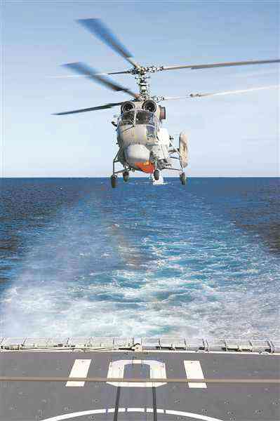 俄方艦載直升機飛臨中方艦艇進行模擬著艦演練。