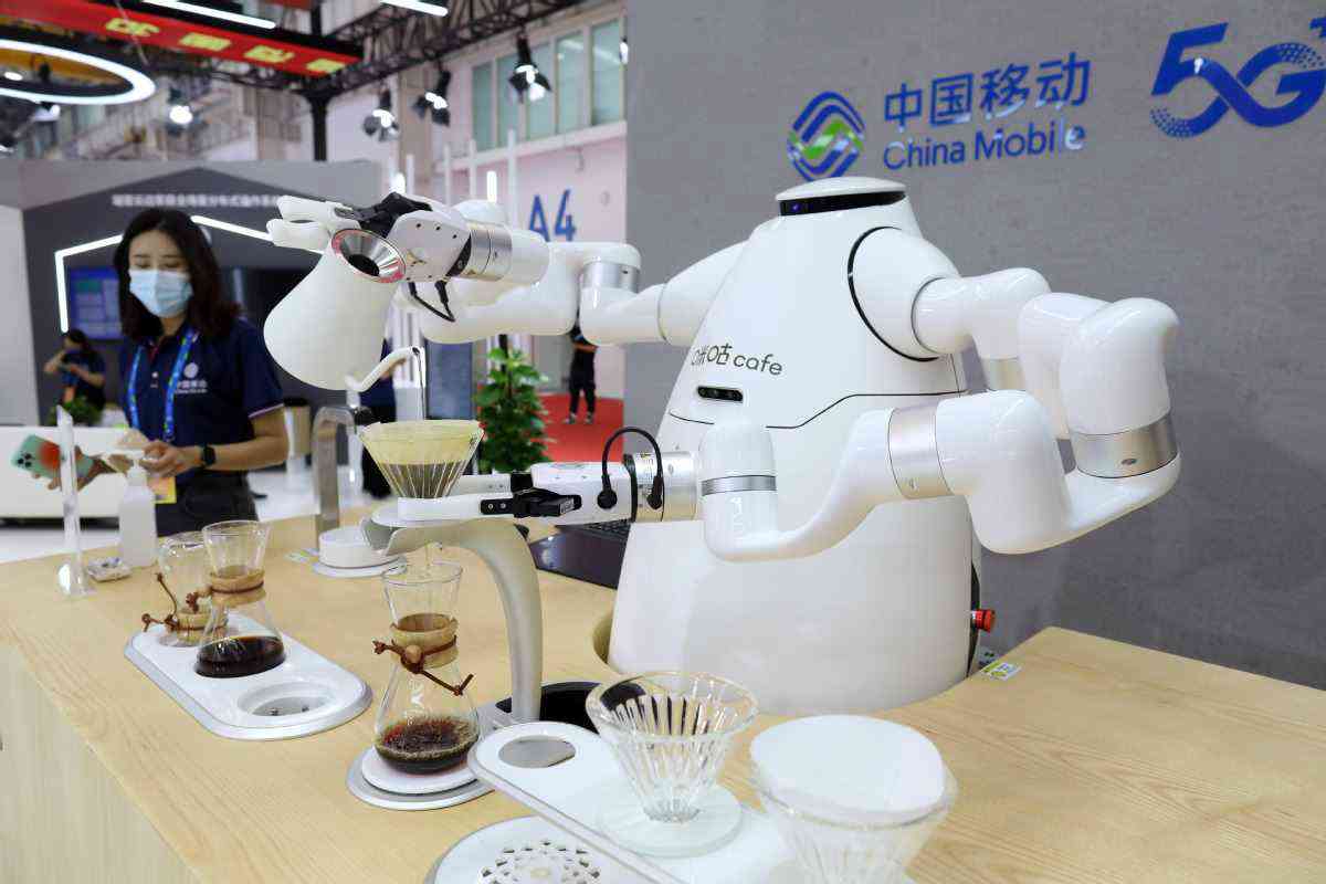8月31日,拍攝大會(huì)展覽上5G智能機(jī)器人演示泡咖啡。中國(guó)日?qǐng)?bào)記者 朱興鑫 攝