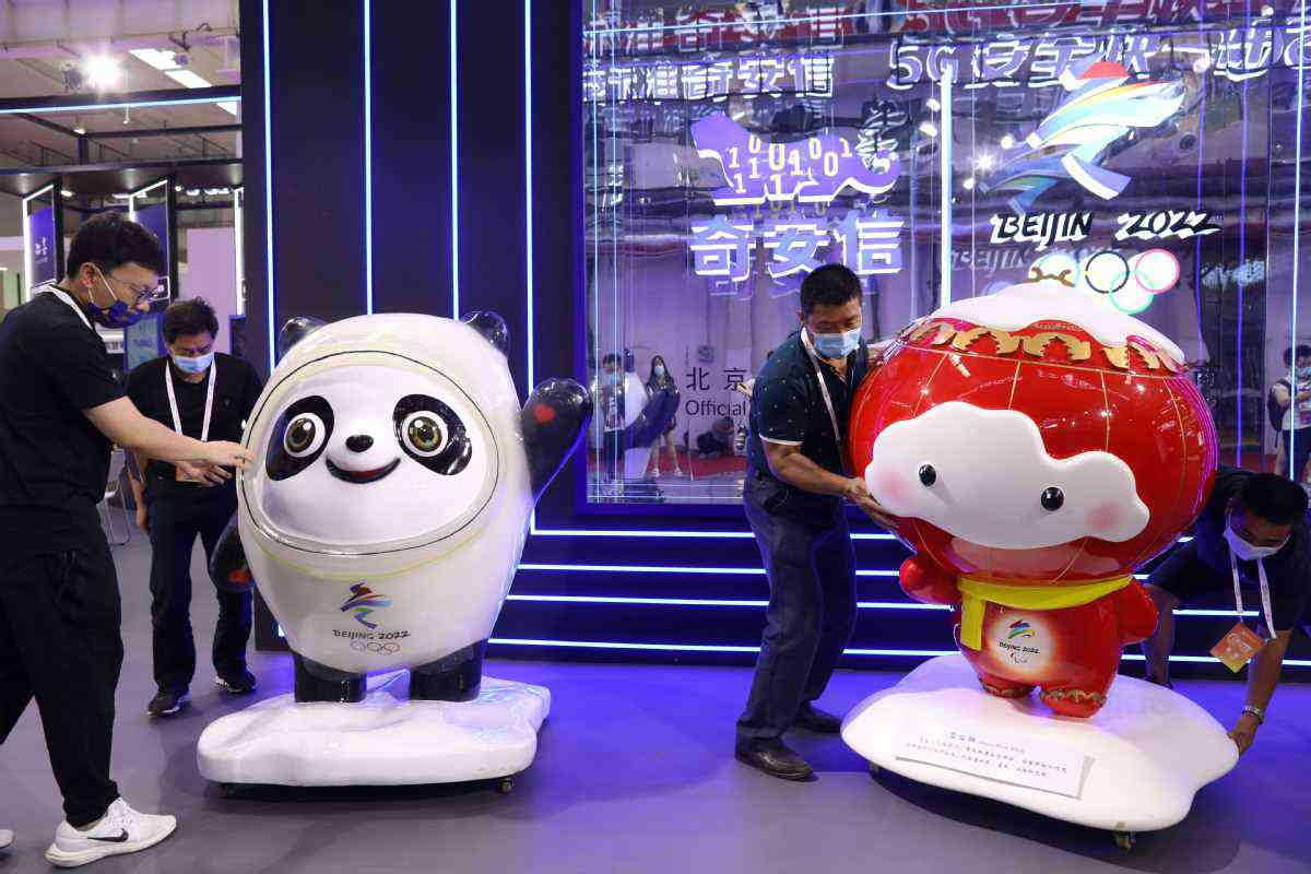 8月31日,工作人員在世界5G大會(huì)展覽上擺放北京冬奧會(huì)和冬殘奧會(huì)吉祥物。 中國(guó)日?qǐng)?bào)記者 朱興鑫 攝