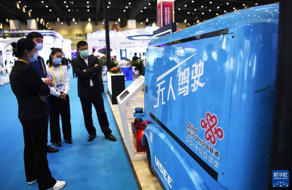 10月10日,觀眾在北斗融合應(yīng)用成果博覽會上參觀一款無人駕駛運輸車。