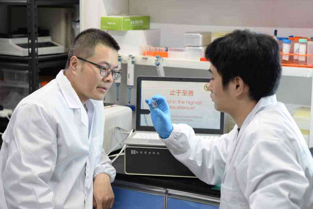 圖為東南大學(xué)生物電子學(xué)國(guó)家重點(diǎn)實(shí)驗(yàn)室劉宏教授(左)與學(xué)生觀察DNA存儲(chǔ)電極。(東南大學(xué)供圖)