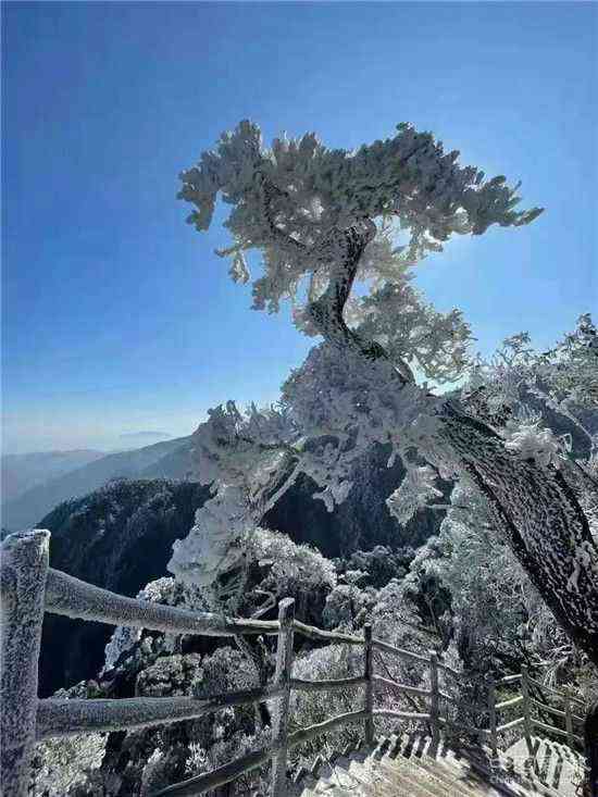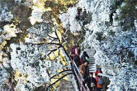 中國(guó)新報(bào)訊(記者 李志德)元旦期間,陽光明媚,天氣晴好,湖南宜章縣莽山五指峰景區(qū)迎來一大批市民和游客觀光游玩。隨著白天氣溫的攀升,莽山五指峰景區(qū)內(nèi)的霧凇,受光照部分的積雪逐漸融化,沒有光照部分的霧凇則保留完整,形成了“陰陽霧凇”的奇景,吸引了眾多游客前來旅游觀光。