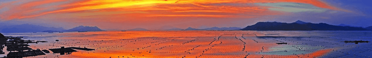 日出時(shí),滿(mǎn)天絢麗的朝霞,產(chǎn)生五彩斑斕的暖色光紋,停泊在海灣灘涂上的數(shù)百只小漁船在朝霞的渲染下十分壯觀。數(shù)不清的網(wǎng)簾,連同作為支柱的竹竿遍布灘涂,淺海上種植海帶的浮筒和網(wǎng)箱養(yǎng)殖的漁排,錯(cuò)落有致,讓灘涂生動(dòng)靚麗起來(lái)。