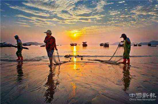 黎明,灘涂始而銀光閃閃,繼而金黃耀眼,黃金般的海浪輕緩地涌向港灣,涌向?yàn)┩浚瑪R淺的小船,靈動(dòng)的水線(xiàn),別致的圍網(wǎng),飛來(lái)的白鷺,趕海的漁民,一一出現(xiàn)。