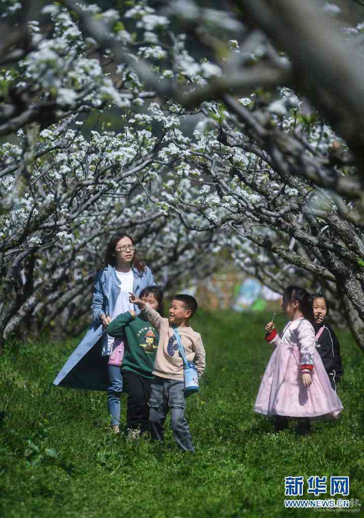 3月26日,游客在梨園中觀賞盛開的梨花。