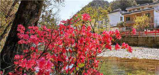 走進鶴城鄉(xiāng),只見山林之間、公路沿線、溪流兩岸,到處盛開著野生的映山紅。嬌艷欲滴的花朵綴滿枝頭,一叢叢、一簇簇,燦若云霞,美如錦繡。沿河而開的映山紅,宛如給一溪碧水鑲嵌上了一條鮮紅的綢帶。美麗的花影倒映在清澈見底的溪水之中,隨著水波蕩漾,呈現(xiàn)出難以描摹的朦朧之美。嬌艷的映山紅,在綠樹、溪水、民居的映襯下,更是美不勝收,令人陶醉。