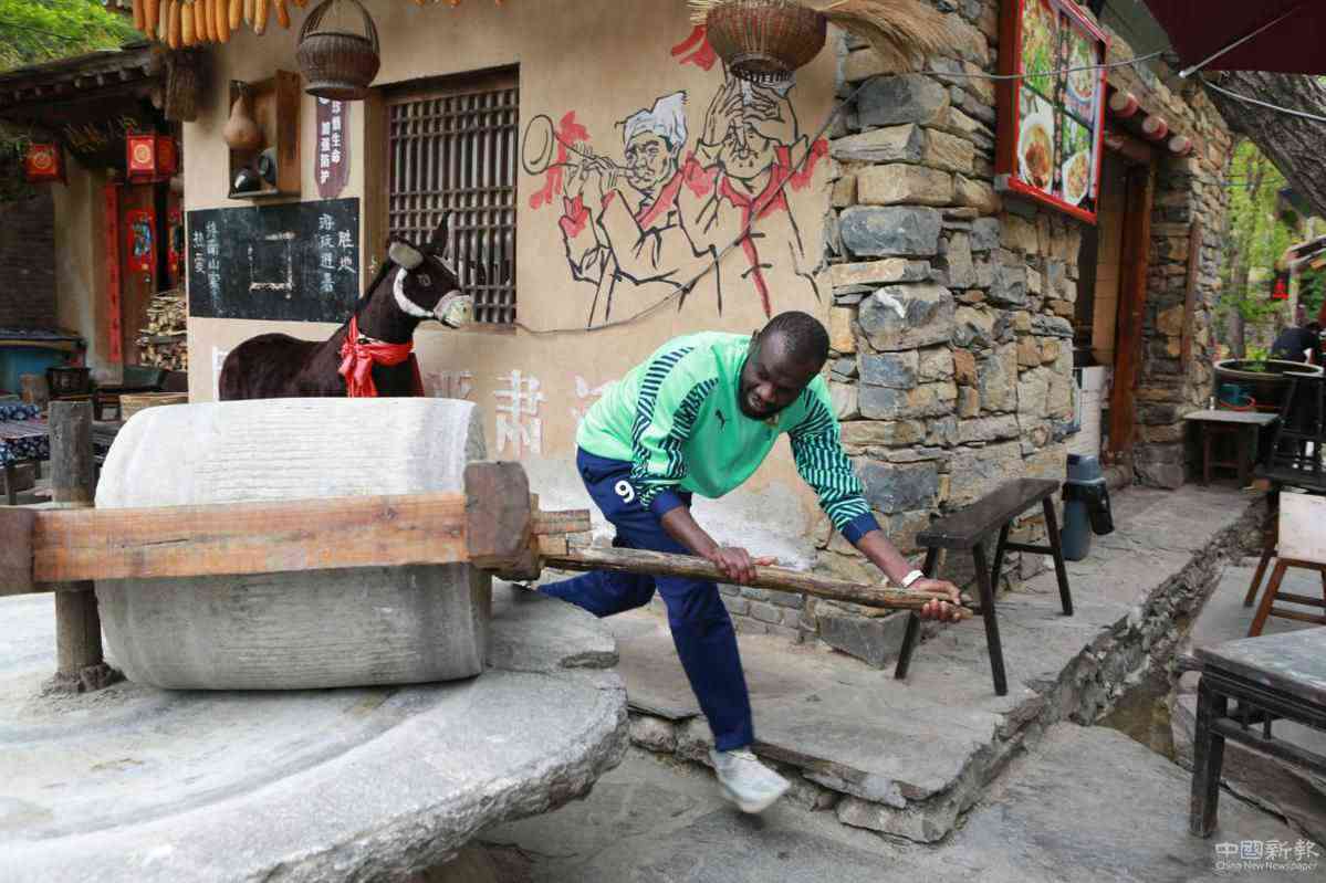 媒體團成員在終南山寨中體驗石磨