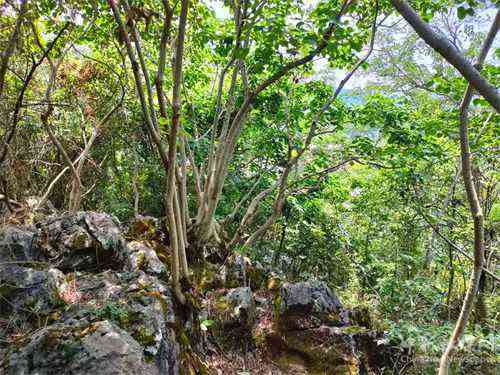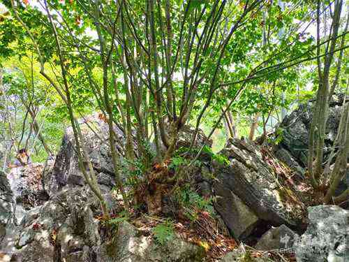 拐過幾道彎,我發(fā)現(xiàn)了一片楓樹林。應(yīng)該是缺土少水的原因,這些楓樹長得并不高大,頂多兩米左右。它們雖也盤根石上但依然長得很旺盛,清風(fēng)徐來,片片葉兒隨風(fēng)起舞,像是在表達(dá)它們的歡迎致意。