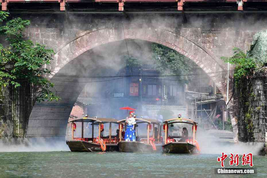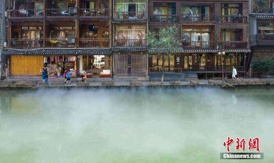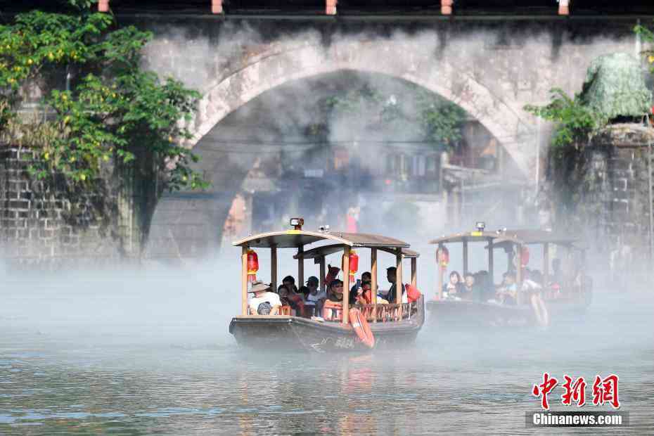 7月14日,湖南鳳凰古城沱江上的人造江霧繚繞古城,游人乘船在霧中航行,如在畫中游。據(jù)悉,這些江霧是由智能人造霧系統(tǒng)制作完成,不但增加了負(fù)離子清潔空氣增濕降塵,還可實現(xiàn)游人在鳳凰古城24小時觀霧景。楊華峰 攝