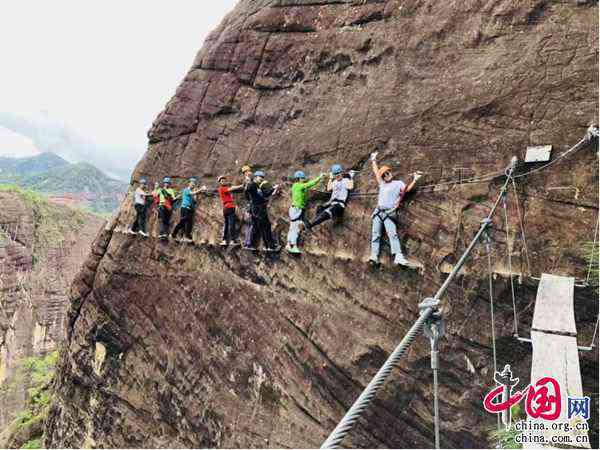 其中黎明景區(qū)的特色體驗(yàn)項(xiàng)目“飛拉達(dá)”是修建在巖壁上,利用鐵索、腳蹬的輔助,進(jìn)行峭壁攀爬的登山體驗(yàn)項(xiàng)目。索道的部件主要有金屬扶手、梯級(jí)、纜索、腳蹬等,這些裝置讓沒有攀巖能力的爬山者也能在陡峭的巖壁上行走。