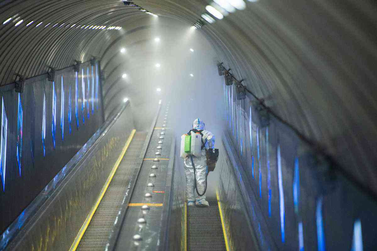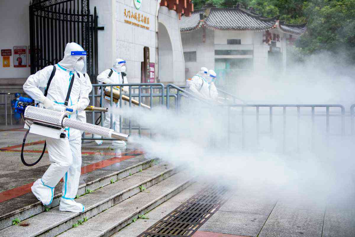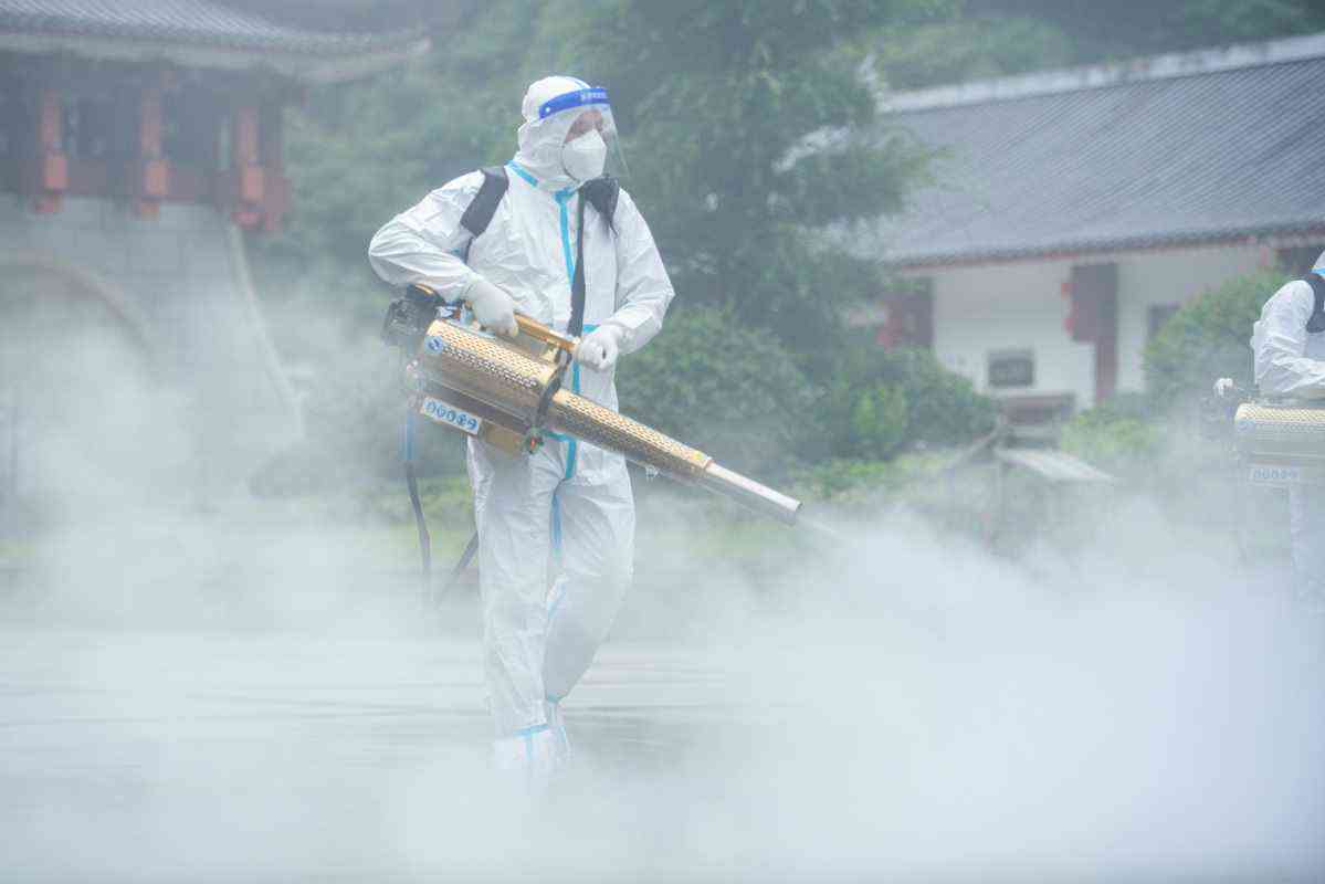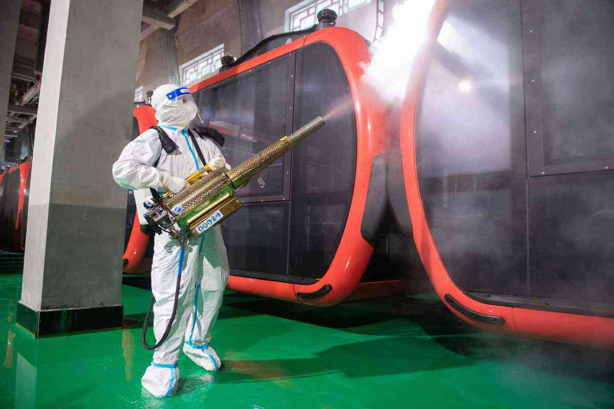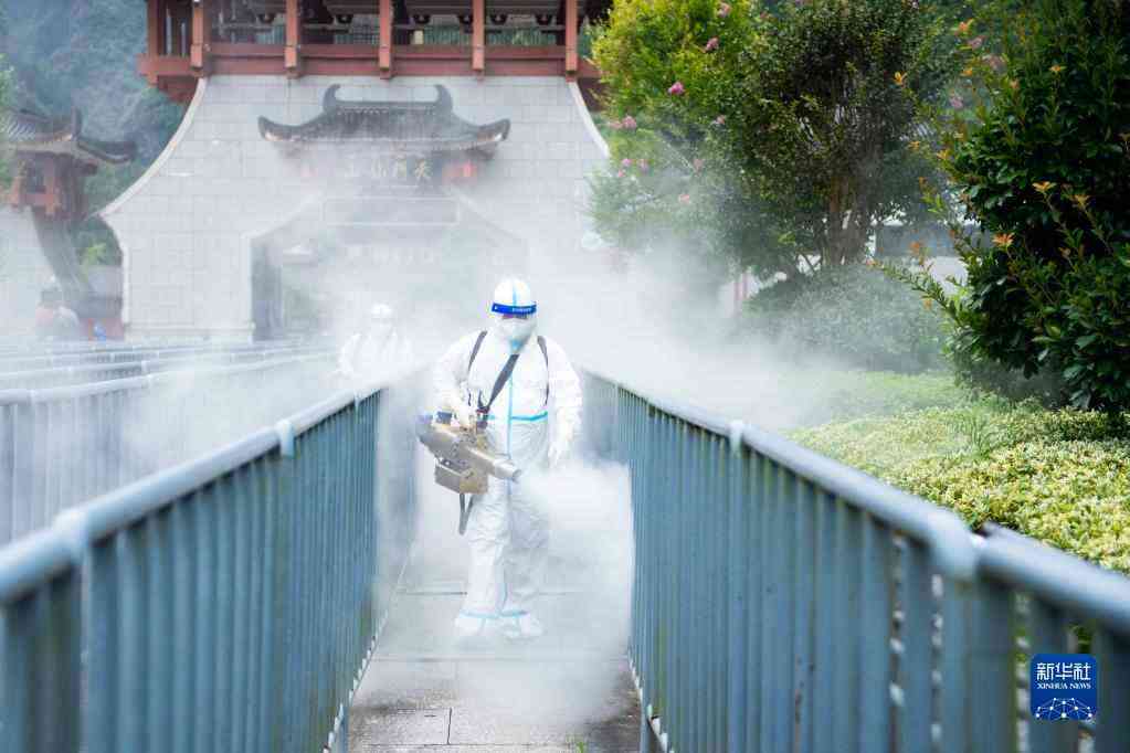 8月26日,在張家界天門山景區(qū)入口處,工作人員給排隊通道消毒。當(dāng)日,在湖南省張家界市天門山景區(qū),工作人員抓緊消殺作業(yè),為重新開園做好準(zhǔn)備工作。據(jù)了解,張家界市8月25日已全域調(diào)整為低風(fēng)險地區(qū)。新華社記者 陳思汗 攝