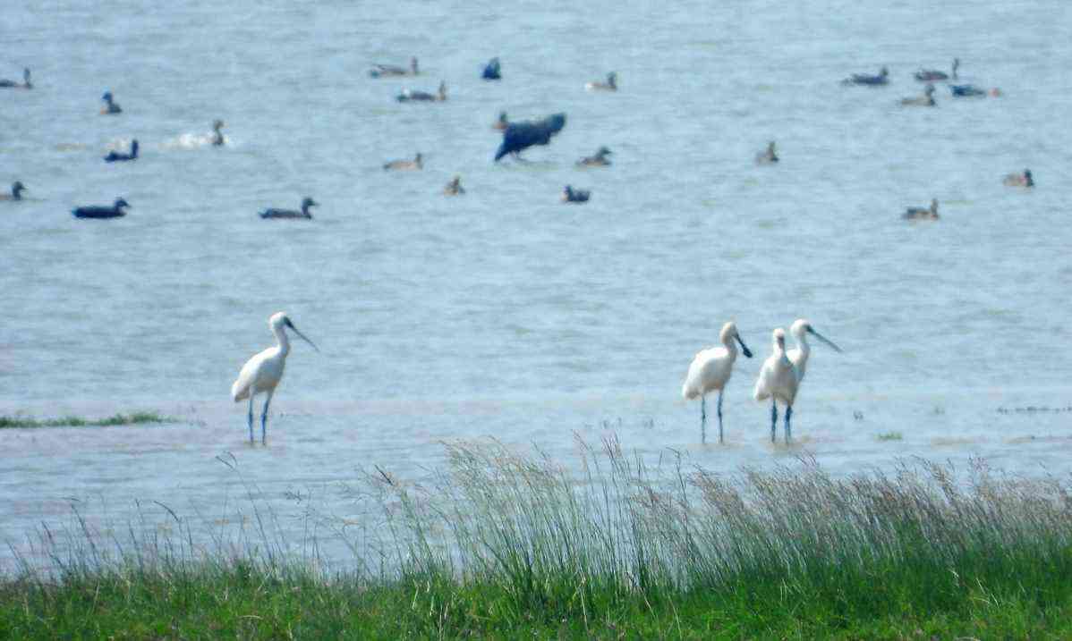 白琵鷺是國家二級保護(hù)動物,大型涉禽,嘴長而直,上下扁平,前端擴(kuò)大呈匙狀,黑色,端部黃色;腳亦較長,黑色,脛下部裸出。夏羽全身白色,頭后枕部具長的發(fā)絲狀羽冠、橙黃色,前額下部具橙黃色頸環(huán),頦和上喉裸露無羽、橙黃色。冬羽和夏羽相似,全身白色,頭后枕部無羽冠,前頸下部亦無橙黃色頸環(huán)。常成群活動,偶爾見單只。休息時(shí)常在水邊成‘一’字形散開,長時(shí)間站立不動。白琵鷺在鄱陽湖最高峰數(shù)量達(dá)萬只以上。(王小龍、羅輝攝影)