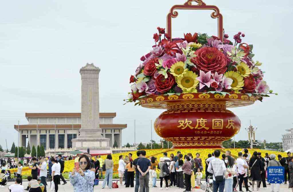 9月25日,游人和市民在天安門(mén)廣場(chǎng)觀賞18米高的“祝福祖國(guó)”巨型花籃。