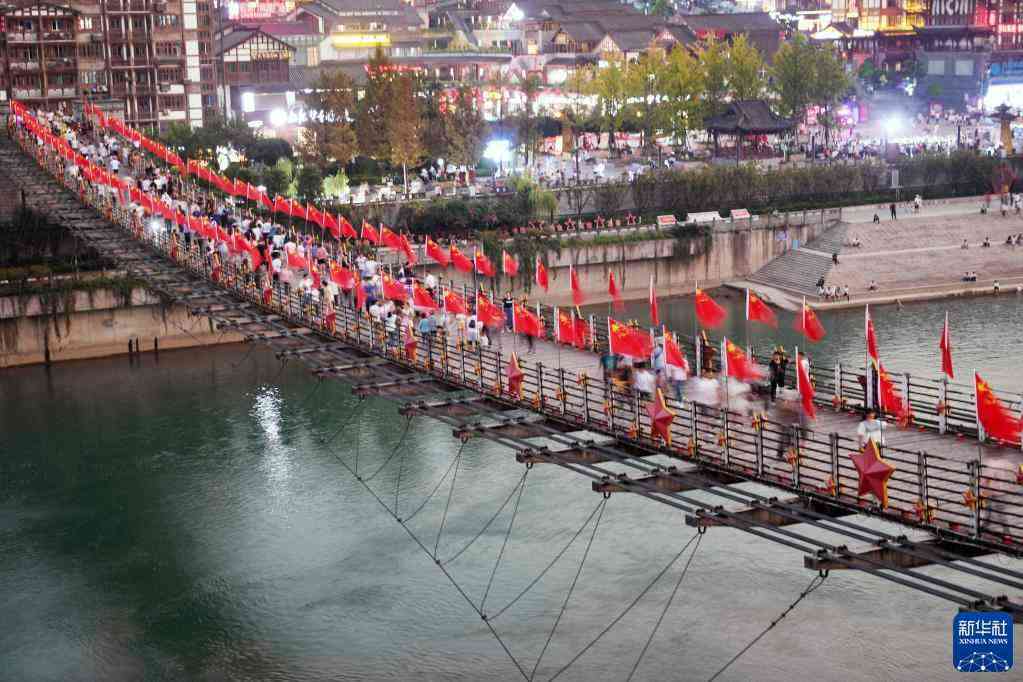 游客在貴州省仁懷市茅臺(tái)鎮(zhèn)茅臺(tái)渡口鐵索橋上參觀(10月2日攝)。