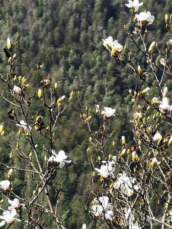 望春花一般在二三月開花??墒窃谛輰幙h鶴城鄉(xiāng)新安源村,眼下卻有一棵望春花樹花開朵朵,令人嘖嘖稱奇。