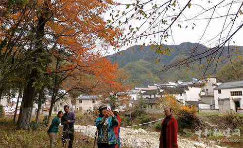 湖南省休寧縣鶴城鄉(xiāng)位于新安江源頭的大山之中,植被繁茂,其中楓香樹(shù)等樹(shù)種廣泛栽植。眼下時(shí)節(jié),來(lái)到鶴城鄉(xiāng)的新安源村,只見(jiàn)高山之下、小溪岸邊,高大古老的香楓樹(shù)連城一排,紅色的黃色的樹(shù)葉披滿枝頭,色彩斑斕,美不勝收。尤其是鮮紅嬌艷的樹(shù)葉,令人立刻想起“停車(chē)坐愛(ài)楓林晚,霜葉紅于二月花”的詩(shī)句。美麗的景色,晴好的天氣,吸引了許多游客前來(lái)休閑觀光。有的在樹(shù)下自由徜徉、盡情嬉戲;有的變換角度、不停拍照,將大自然饋贈(zèng)的美景定格在鏡頭、珍藏在心間。(盛紅兵 宋建忠)