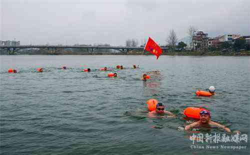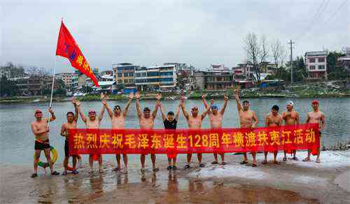 為紀(jì)念毛澤東誕辰128周年,12月26日下午4時(shí),湖南新寧縣崀山冬泳隊(duì)員冒著零下2度的寒冷天氣,扛著隊(duì)旗正在縣城白公渡大橋上游刺骨的水中橫渡夫夷江。