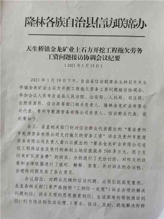 關(guān)于金龍礦業(yè)欠薪問題,該開科室負(fù)責(zé)人認(rèn)為主體單位還得依靠隆林各族自治縣人社局,自然資源局只是配合相關(guān)部門督促金龍礦業(yè)公司籌集資金對拖欠農(nóng)民工資進(jìn)行發(fā)放。他說,金龍礦業(yè)公司拖欠民工工資隆林各族自治縣里的領(lǐng)導(dǎo)相當(dāng)重視,2021年1月19日召開由法院、公安局、人社局、司法局、自然資源局、信訪局、隆林金龍礦業(yè)公司代表、貴州亨乾源勞務(wù)有限公司、信訪群眾代表參加的信訪聯(lián)席會,會議責(zé)成金龍礦業(yè)公司趕快籌集資金發(fā)放民工工資。