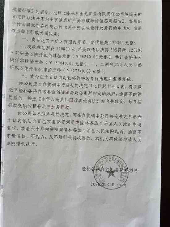 隆林各族自治縣自然資源局礦權(quán)股的負(fù)責(zé)人聽聞記者的來意,聲稱,自然資源局的職責(zé)主要是礦山開采及證照的發(fā)放,如果涉及礦山違法違規(guī),他們義不容辭的給與處罰。在這為負(fù)責(zé)人提供的編號為006號的行政處罰書中顯示:坡攏金礦在開采中未按照審批的紅線范圍進(jìn)行開采,存在越界開采礦產(chǎn)資源的到非法行為,違反了《中華人民共和國礦產(chǎn)資源法》第三條的規(guī)定。行政處罰一:責(zé)令退回本礦區(qū)范圍內(nèi)開采,賠償損失170300元整;二:沒收非法所得120800元,并處以違法所得30%罰款,兩項(xiàng)共計(jì)人民幣327340.三:在十五日內(nèi)對破壞的耕地自行治理并復(fù)墾復(fù)綠。