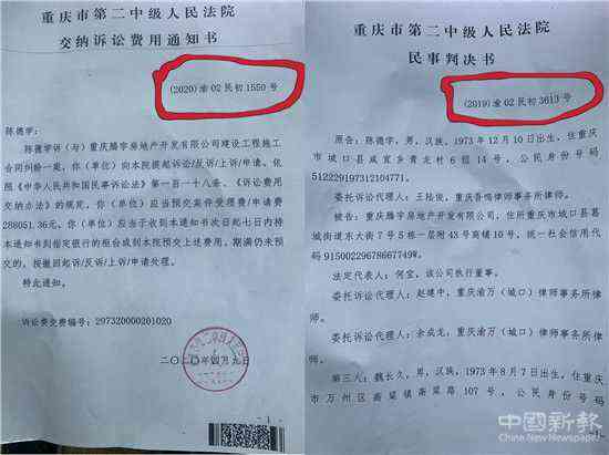 該案件源于重慶市城口縣建筑承包人陳德學在參與城口縣城商品房騰宇中央新城的建設(shè)施工中,所參與的工程量涉及金額約1億元。因與開發(fā)商工程款結(jié)算糾紛,陳德學于2019年8月將開發(fā)商騰宇公司及第三人告上法庭,要求支付工程款及相關(guān)款項近5000萬元。案件由城口縣人民法院轉(zhuǎn)至重慶市第二中級人民法院立案,案件號為:2019渝02民初3613號。2020年4月9日,此案正在審理過程中,判決書尚未下達時,重慶市第二中級人民法院再次向陳德學發(fā)出一份《繳納訴訟費用通知書》,此通知書顯示的案件編號為:2020渝02民初1550號。